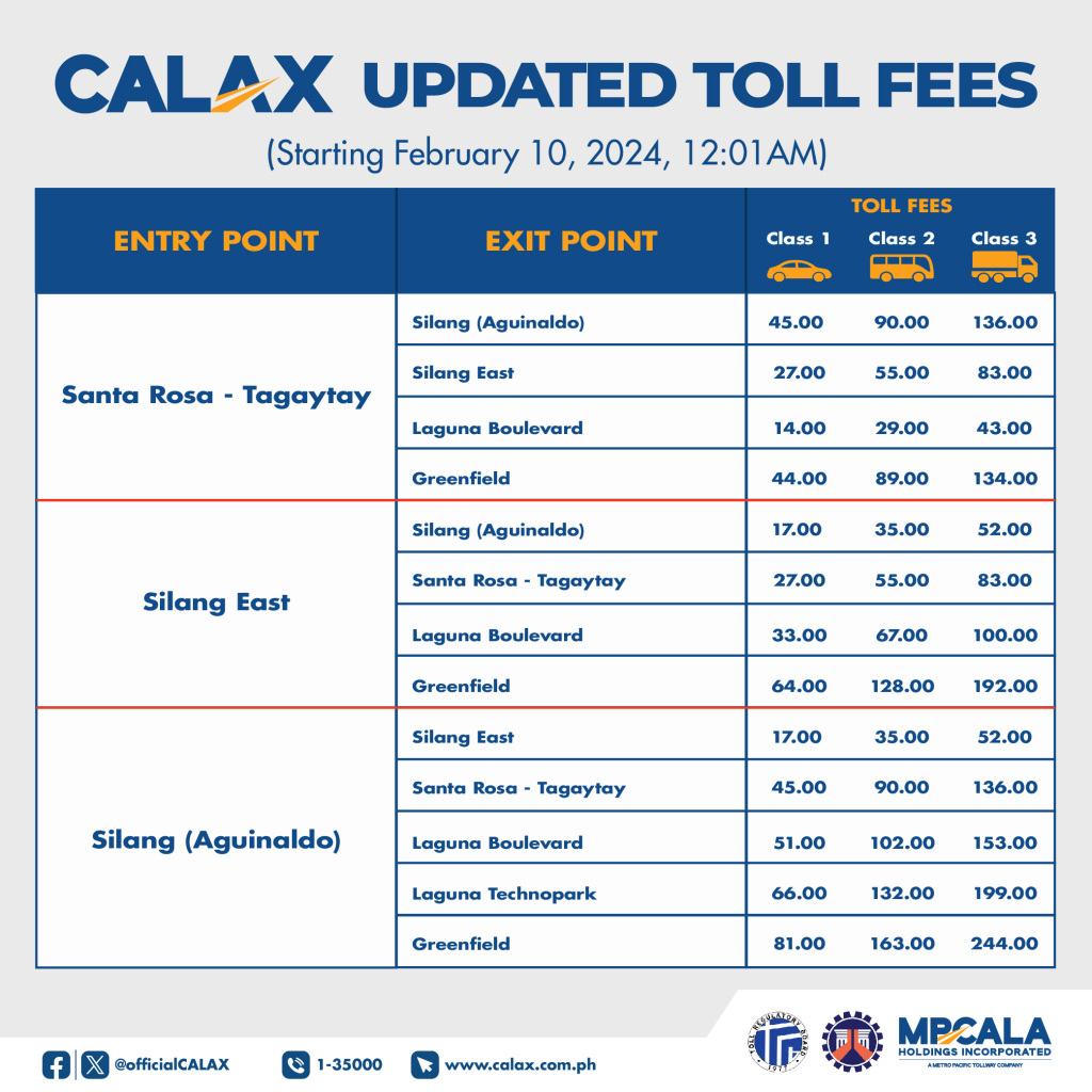 APRUBADO na ng Toll Regulatory Board (TRB)ang pangongolekta ng toll para sa bagong Silang (Aguinaldo) Interchange ng Cavite-Laguna Expressway (CALAX) simula 12:01 AM sa Pebrero 10, 2024, Sabado.